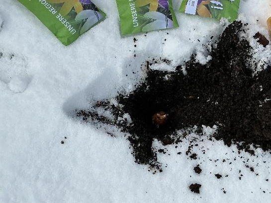 Die Krokuszwiebeln sind in ca. 6 – 8 cm Tiefe und im Abstand von ca. 10 cm eingepflanzt worden.<(ü>